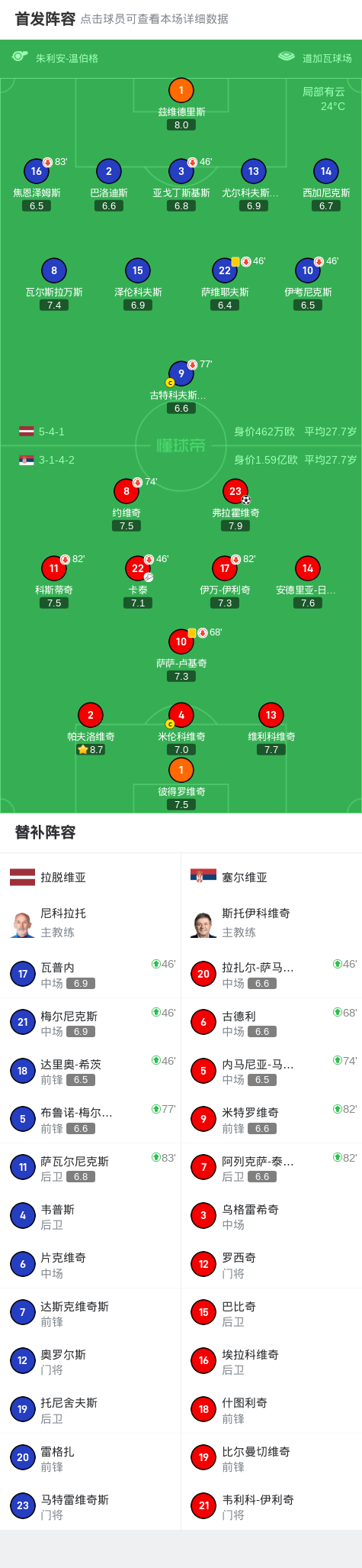 北京时间9月6日世界杯欧洲区预选赛 第一阶段小组赛 第5轮,拉脱维亚对阵塞尔维亚。塞尔维亚弗拉霍维奇破门。最终比分拉脱维亚 0-1 塞尔维亚。